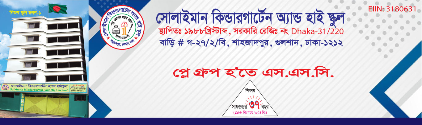 শিক্ষা একটি জাতির আত্ম পরিচয়ের বাহন। যে জাতি যত বেশি শিক্ষিত সভ্যতার ইতিহাসে সেই জাতি তত বেশি উন্নত ও সমৃদ্ধ। একটি দেশকে সার্বিক অগ্রগতির দিকে এগিয়ে নিতে শিক্ষা হচ্ছে মৌলিক, শিক্ষা হচ্ছে পূর্বশর্ত। প্রতিযোগিতামূলক বিশ্বে আমাদেরকে সভ্য ও সমৃদ্ধ জাতি হিসেবে প্রতিষ্ঠিত করতে শিক্ষার কোনো বিকল্প নেই। শিক্ষার স¤প্রসারণ ও গুণগত মানোন্নয়ন আমাদের সমাজ, জাতি তথা দেশকে উন্নতি ও সমৃদ্ধির শীর্ষে পৌঁছে দিতে পারে। এ লক্ষ্যকে সামনে রেখে ১৯৮৮ খ্রিস্টাব্দে রাজধানী ঢাকার গুলশান থানাধীন শাহ্জাদপুরে প্রতিষ্ঠা করি সোলাইমান কিন্ডারগার্টেন নামের বিদ্যাপীঠটি। ১৯৮৮ ও ১৯৮৯ খ্রিস্টাব্দে স্কুলটি সাফল্যের সাথে পরিচালিত হওয়ায় ১৯৯০ খ্রিস্টাব্দে গণপ্রজাতন্ত্রী বাংলাদেশ সরকারের দৃষ্টি আকৃষ্ট হয় এ স্কুলটির প্রতি। সরকার ১৯৯০ খ্রিস্টাব্দে গুলশান থানার কিন্ডারগার্টেন ও সমমানের স্কুলসমূহের মধ্য হ’তে সর্বপ্রথম সোলাইমান কিন্ডারগার্টেনকে অনুমোদন দেন। ১৯৮৮ খ্রিস্টাব্দ হ’তে বিগত বছরগুলোতে মেধাস্থানসহ ট্যালেন্টপুল ও সাধারণ গ্রেডে সরকারি প্রাথমিক বৃত্তিপ্রাপ্তি, প্রাথমিক শিক্ষা সমাপনী পরীক্ষায় ১০০% প্রথম বিভাগ, এ+ এবং এ গ্রেড অর্জন ও এস.এস.সি. পরীক্ষায় স্টার মার্কস ও প্রথম বিভাগ এবং এ+ প্রাপ্তিসহ কৃতিত্বপূর্ণ ফলাফল অর্জন করেছে। আমি দৃঢ়ভাবে বিশ্বাস করি শিক্ষাদান ও শিক্ষাগ্রহণ কার্যক্রমকে অধিক ফলপ্রসূ ও সফল করার জন্য শিক্ষকের আন্তরিকতা, শিক্ষার্থীর মনোনিবেশ ও অভিভাবকের সচেতনতার গুরুত্ব অপরিসীম। সকলের ঐকান্তিক ও সার্বিক সহযোগিতা আমাদের অব্যাহত প্রচেষ্টাকে সবসময় গতিশীল রাখবে এ প্রত্যাশা আমার একান্ত হৃদয়ের।